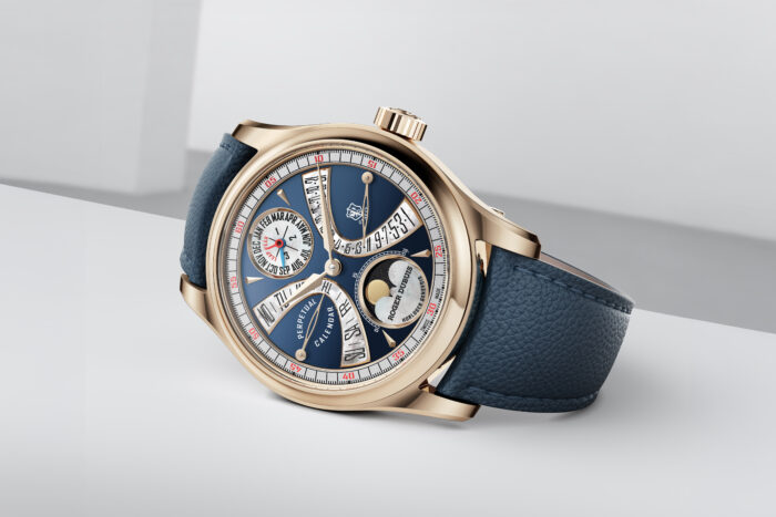 Le cadran multicouche offre une expérience visuelle unique : cinq strates décorées, associant laque bleu profond, nacre et or, mettent en lumière l’affichage bi-rétrograde emblématique de la marque. Cette complication technique illustre le génie et la maîtrise des artisans suisses, capables d’allier beauté et performance.